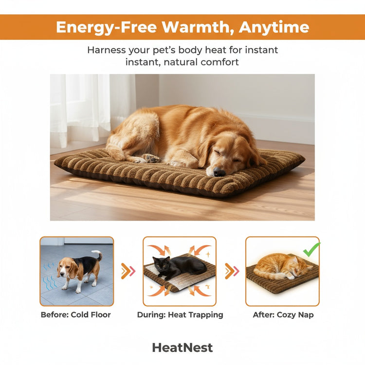 A heat-reflecting mylar film traps your pet’s body heat and returns it, providing instant, energy-free warmth.